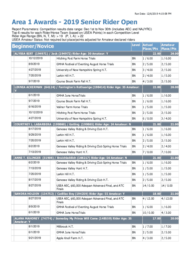 Run Date: 12/6/2019 4:10:08 Area 1 Awards 2019 Senior Rider Open