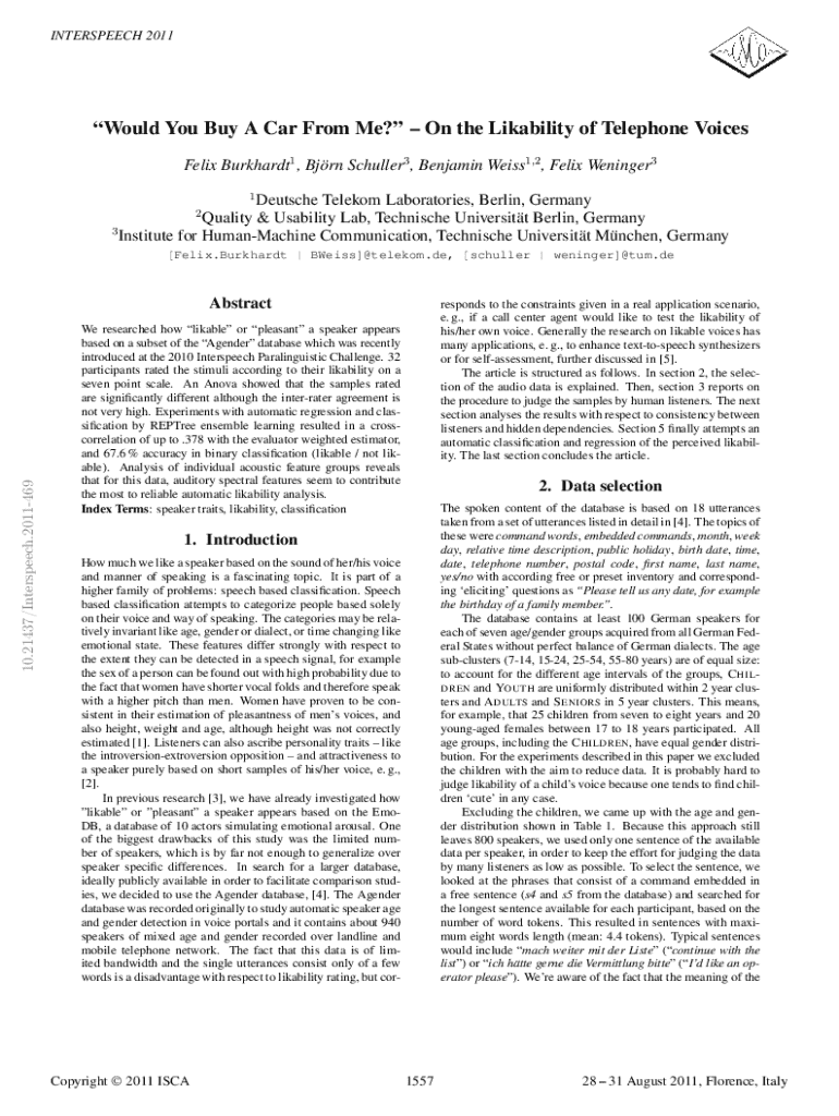 INTERSPEECH 2011Would You Buy A Car From Me? On the Likability of Telephone Voices Felix Burkhardt1 , Bjorn Schuller3 , Benjamin Weiss1,2 , Felix Weninger3 Deutsche Telekom Laboratories, Berlin, Germany