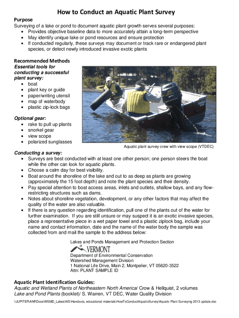 How to Conduct an Aquatic Plant Survey Purpose Surveying of a lake or pond to document aquatic plant growth serves several purposes: Provides objective baseline data to more accurately attain a longterm