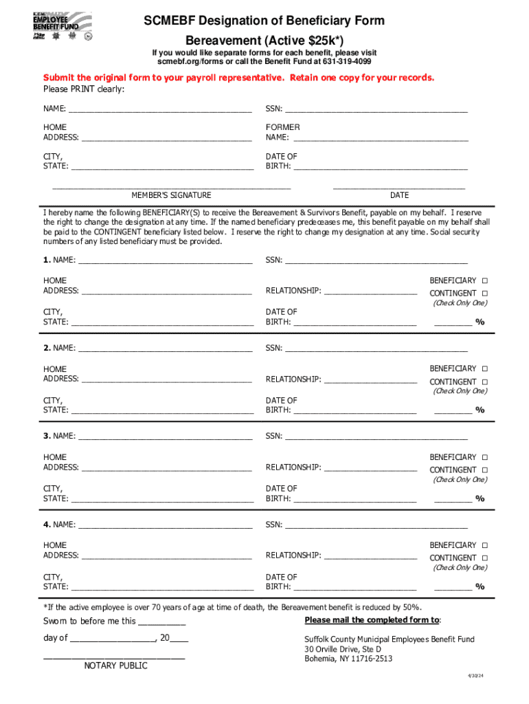 SCMEBF Designation of Beneficiary Form Bereavement (Active $25k*) If you would like separate forms for each benefit, please visit scmebf.org/forms or call the Benefit Fund at 6313194099Submit the