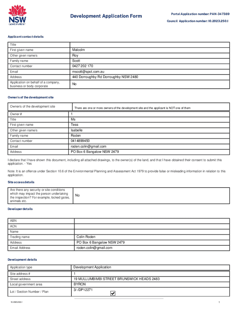 Development Application FormPortal Applicationnumber:PAN347389 Council Applicationnumber:10.2023.250.1Applicant contact detailsTitle First given nameMalcolmOther given name/sRoyFamily nameScottContact
