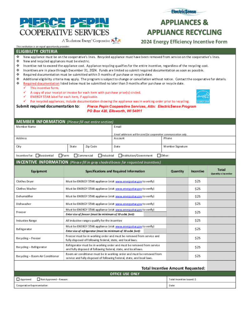2024 Energy Efficiency Incentive Form This institution is an equal opportunity provider.ELIGIBILITY CRITERIA New appliance must be on the cooperatives lines. Recycled appliance must have been removed