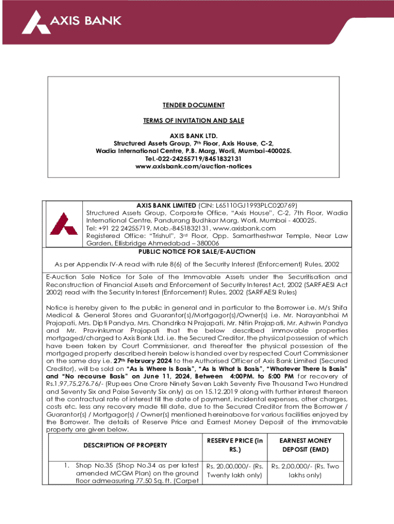 TENDER DOCUMENT TERMS OF INVITATION AND SALE AXIS BANK LTD. Structured Assets Group, 7th Floor, Axis House, C2, Wadia International Centre, P.B. Marg, Worli, Mumbai400025. Tel.02224255719/8451832131