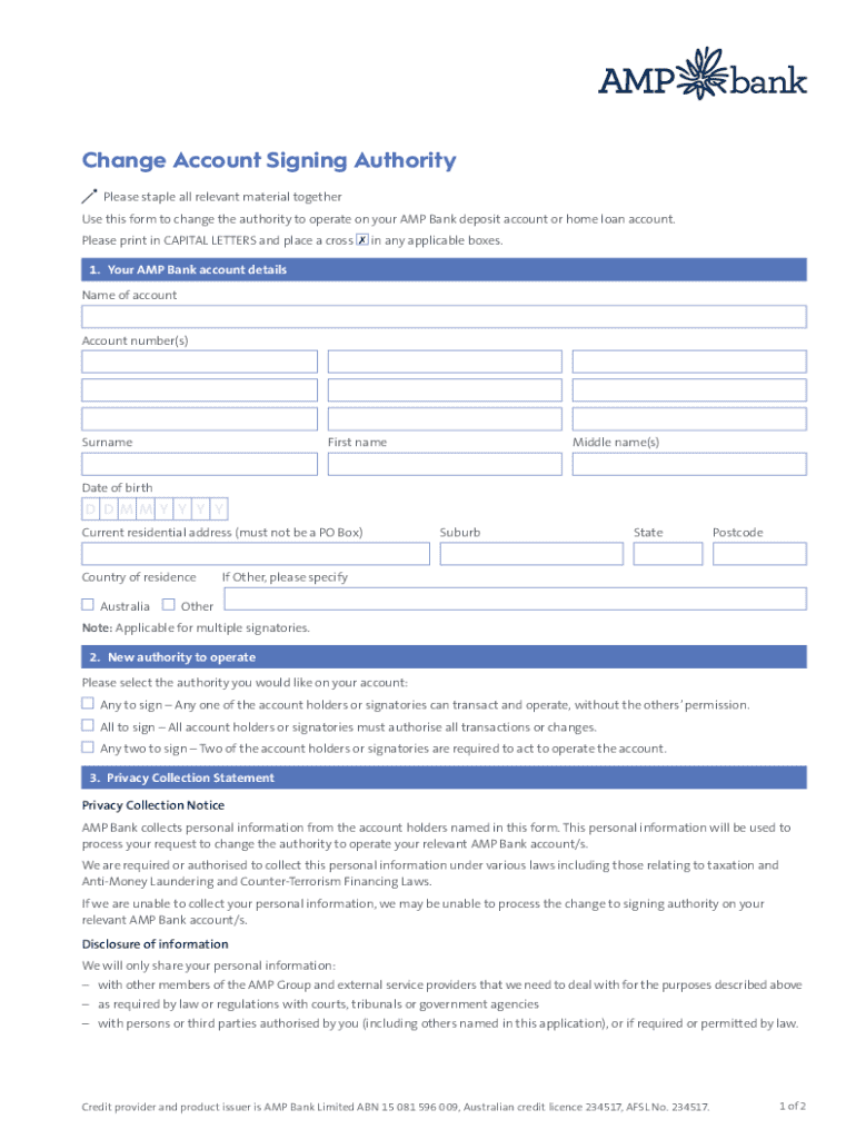 Change Account Signing Authority Please staple all relevant material together Use this form to change the authority to operate on your AMP Bank deposit account or home loan account. Please print in