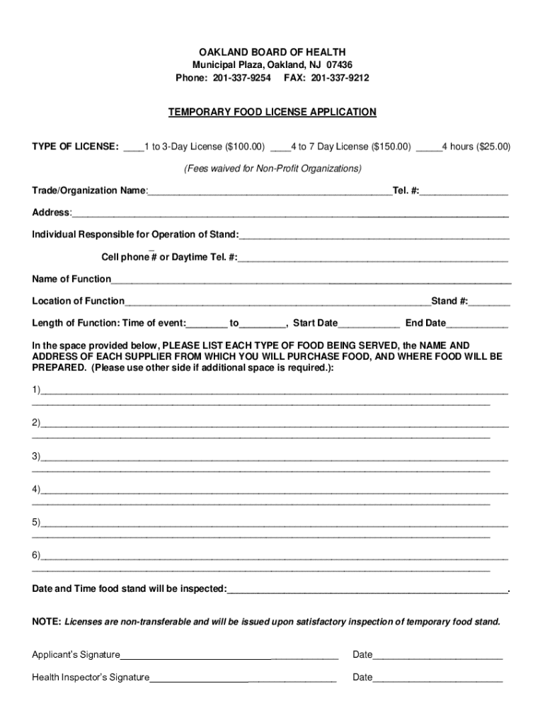 OAKLAND BOARD OF HEALTH Municipal Plaza, Oakland, NJ 07436 Phone: 2013379254 FAX: 2013379212 TEMPORARY FOOD LICENSE APPLICATIONTYPE OF LICENSE: ___1 to 3Day License ($100.00) ___4 to 7 Day License