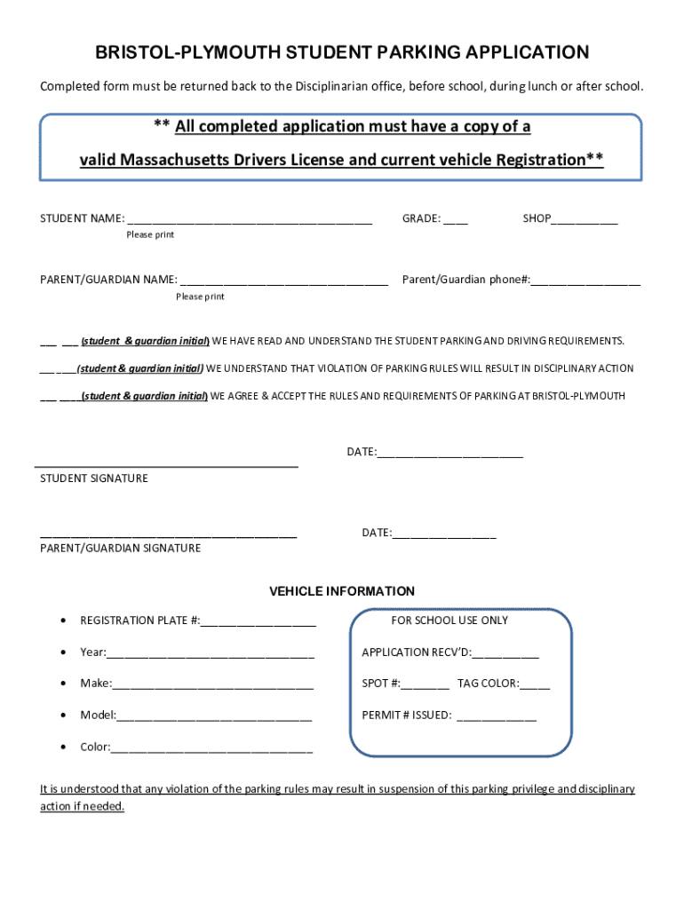 BRISTOLPLYMOUTH STUDENT PARKING APPLICATION Completed form must be returned back to the Disciplinarian office, before school, during lunch or after school.** All completed application must have a