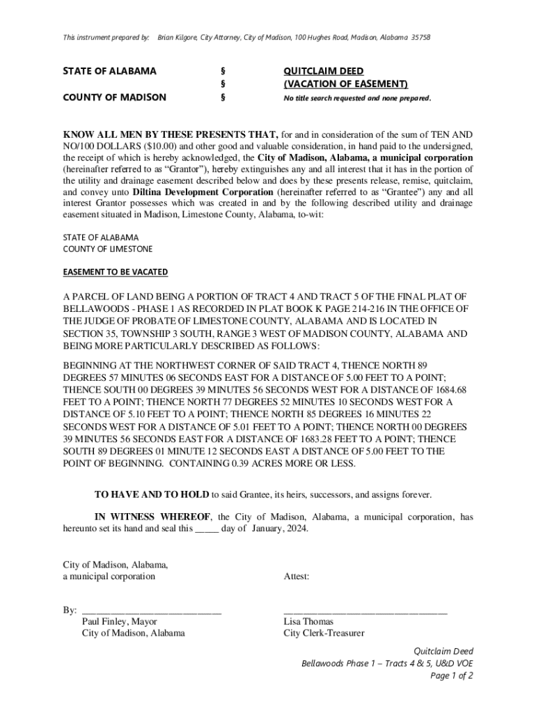 This instrument prepared by:Brian Kilgore, City Attorney, City of Madison, 100 Hughes Road, Madison, Alabama 35758STATE OF ALABAMA COUNTY OF MADISON QUITCLAIM DEED (VACATION OF EASEMENT) No title