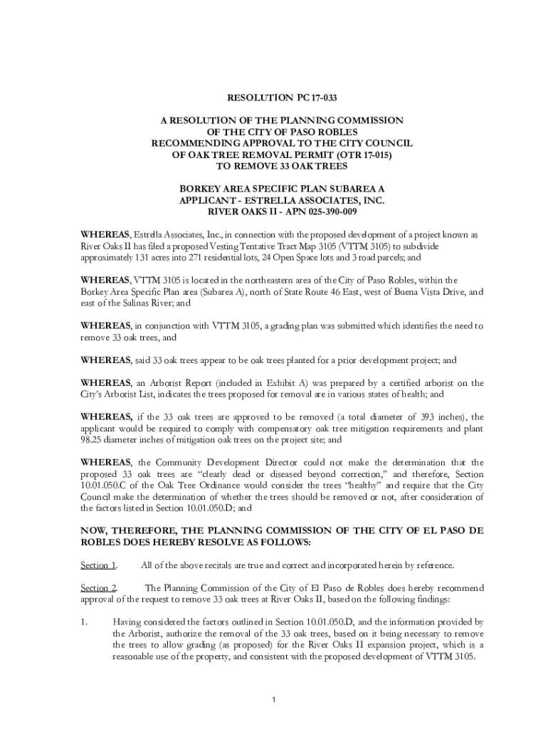 RESOLUTION PC 17033 A RESOLUTION OF THE PLANNING COMMISSION OF THE CITY OF PASO ROBLES RECOMMENDING APPROVAL TO THE CITY COUNCIL OF OAK TREE REMOVAL PERMIT (OTR 17015) TO REMOVE 33 OAK TREES BORKEY