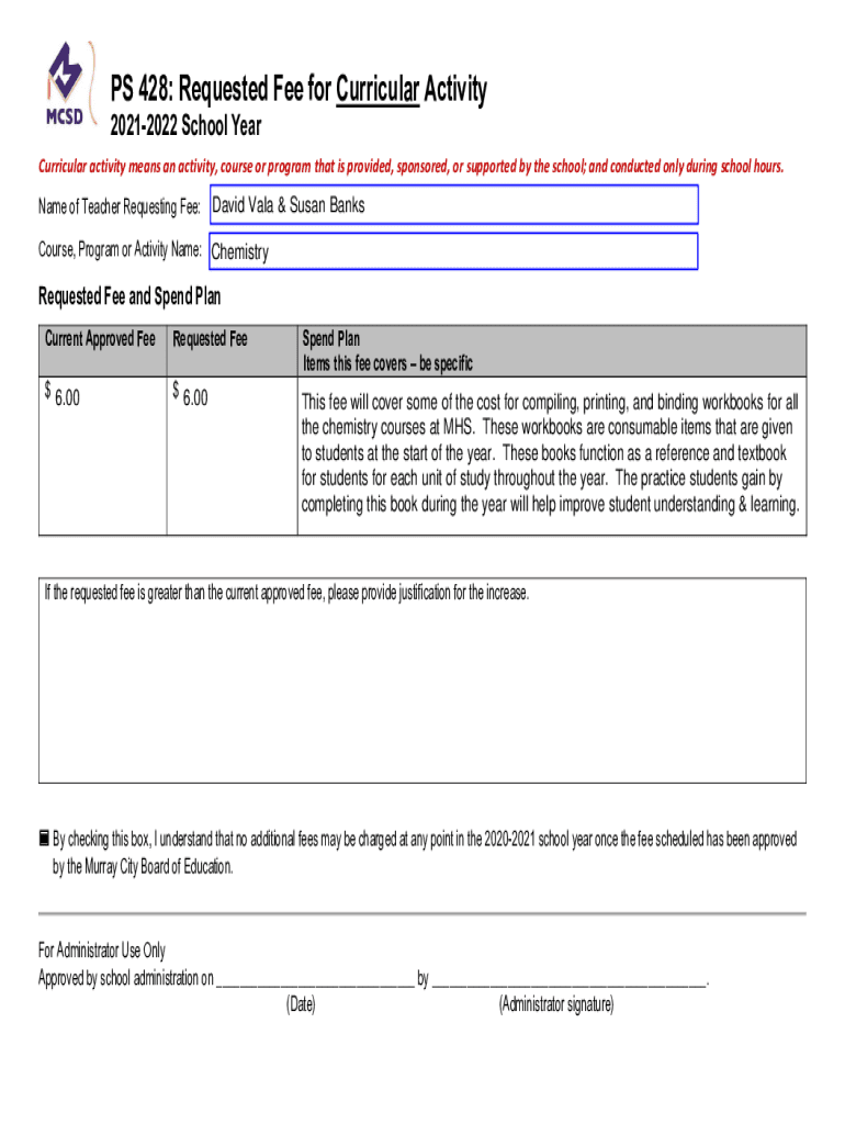 PS 428: Requested Fee for Curricular Activity 20212022 School YearCurricular activity means an activity, course or program that is provided, sponsored, or supported by the school; and conducted only