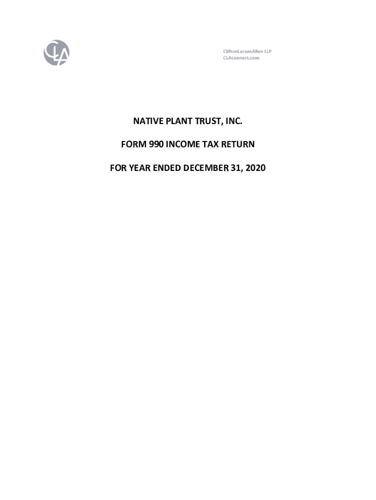 NATIVE PLANT TRUST, INC. FORM 990 INCOME TAX RETURN FOR YEAR ENDED DECEMBER 31, 2020Form990Return of Organization Exempt From Income TaxOMB No. 15450047| Do not enter social security numbers on this