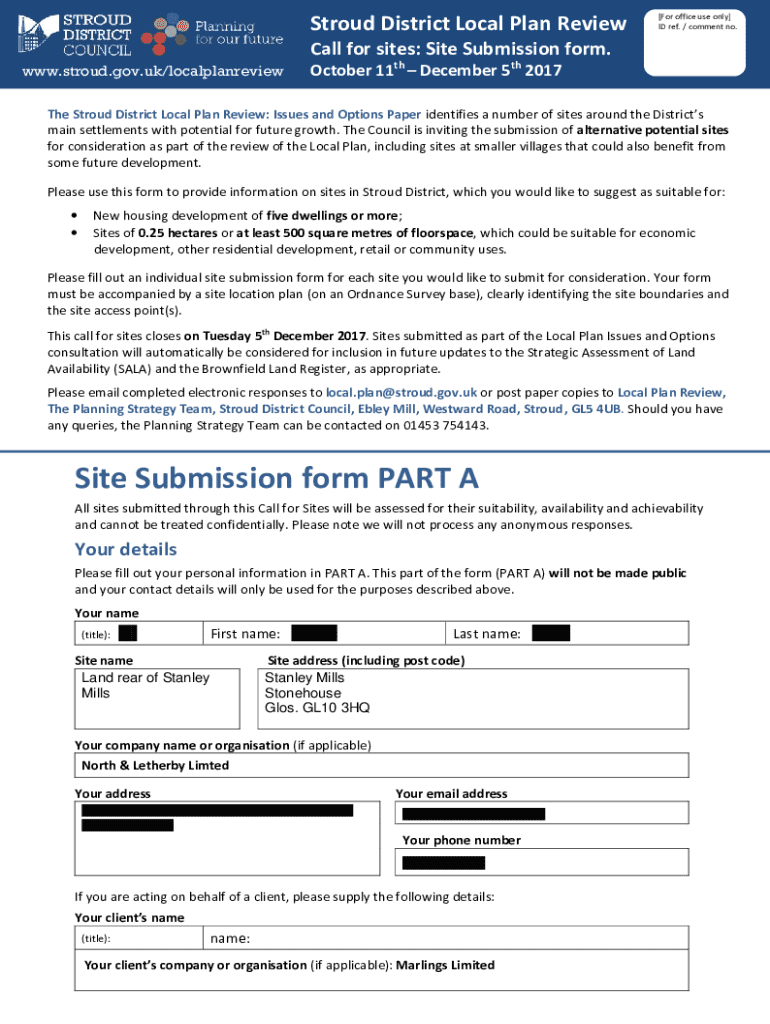 Stroud District Local Plan Review[For office use only] ID ref. / comment no.Call for sites: Site Submission form. www.stroud.gov.uk/localplanreviewOctober 11th December 5th 2017The Stroud District