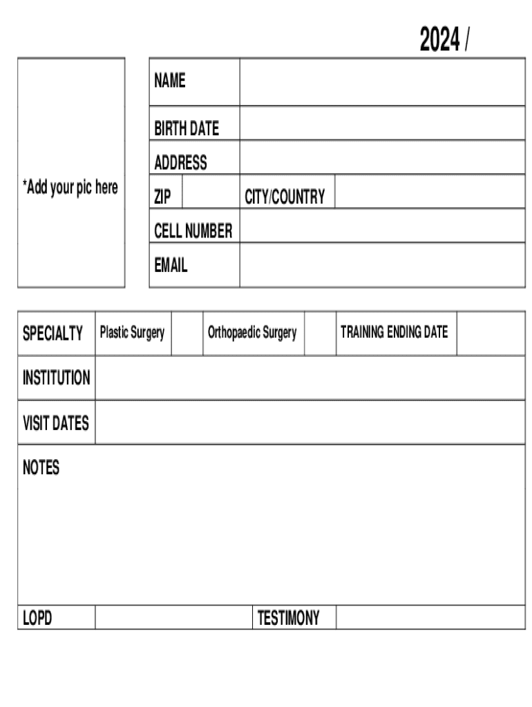 2024 / NAME BIRTH DATE ADDRESS *Add your pic hereZIPCITY/COUNTRYCELL NUMBER EMAIL SPECIALTYPlastic SurgeryOrthopaedic SurgeryINSTITUTION VISIT DATES NOTESLOPDTESTIMONYTRAINING ENDING DATE