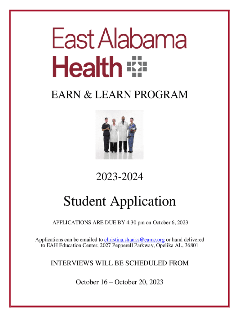 EARN & LEARN PROGRAM20232024Student Application APPLICATIONS ARE DUE BY 4:30 pm on October 6, 2023 Applications can be emailed to christina.shanks@eamc.org or hand delivered to EAH Education Center,
