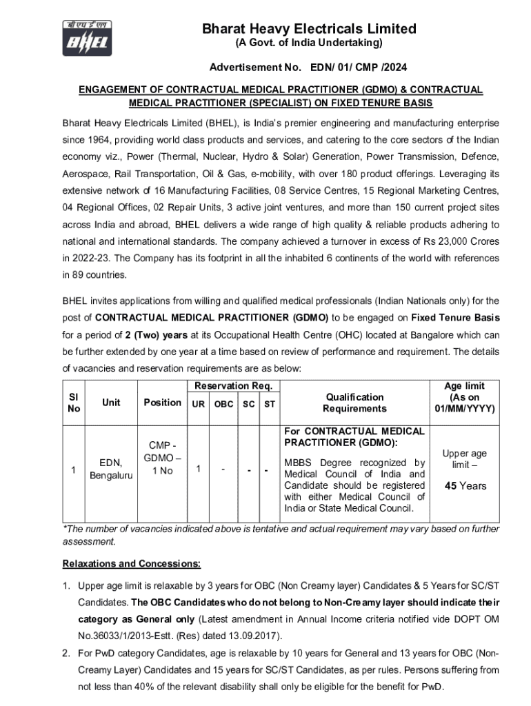 Bharat Heavy Electricals Limited (A Govt. of India Undertaking)Advertisement No. EDN/ 01/ CMP /2024 ENGAGEMENT OF CONTRACTUAL MEDICAL PRACTITIONER (GDMO) & CONTRACTUAL MEDICAL PRACTITIONER (SPECIALIST)