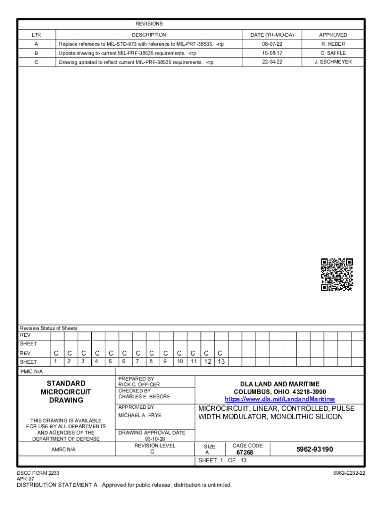 REVISIONS LTRDATE (YRMODA)APPROVEDAReplace reference to MILSTD973 with reference to MILPRF38535. rrpDESCRIPTION080722R. HEBERBUpdate drawing to current MILPRF38535 requirements. rrp150817C. SAFFLECDrawing