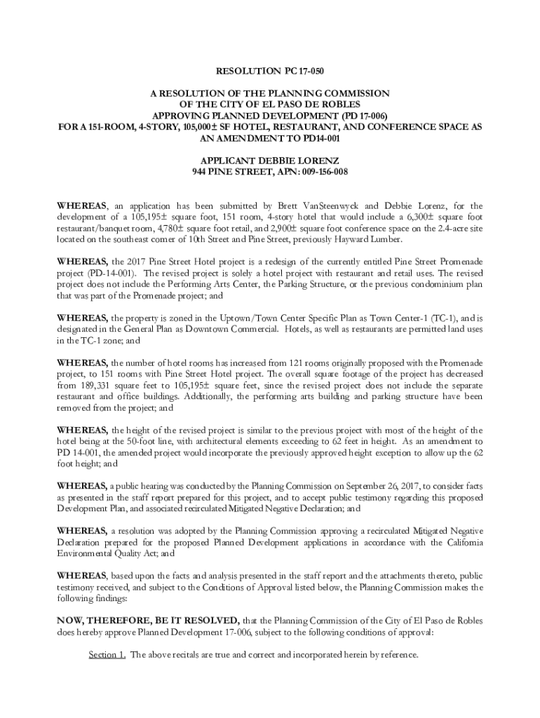 RESOLUTION PC 17050 A RESOLUTION OF THE PLANNING COMMISSION OF THE CITY OF EL PASO DE ROBLES APPROVING PLANNED DEVELOPMENT (PD 17006) FOR A 151ROOM, 4STORY, 105,000 SF HOTEL, RESTAURANT, AND CONFERENCE