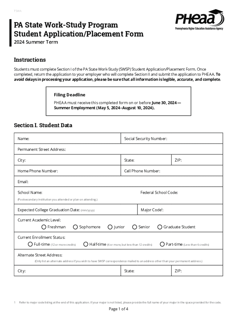 TSWAPA State WorkStudy Program Student Application/Placement Form 2024 Summer TermInstructions Students must complete Section I of the PA State WorkStudy (SWSP) Student Application/Placement Form.