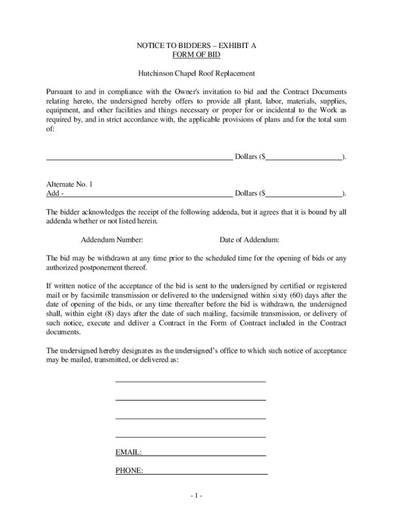 NOTICE TO BIDDERS EXHIBIT A FORM OF BID Hutchinson Chapel Roof Replacement Pursuant to and in compliance with the Owner\'s invitation to bid and the Contract Documents relating hereto, the undersigned