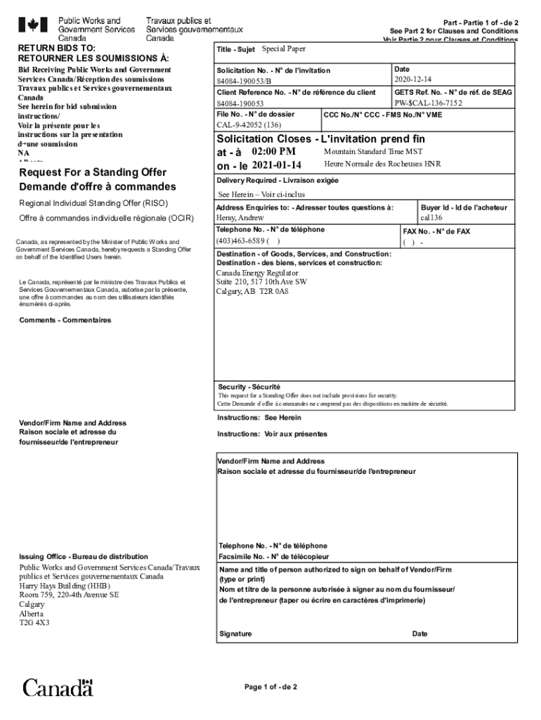 1Part Partie 1 of de 2 See Part 2 for Clauses and Conditions Voir Partie 2 pour Clauses et Conditions1RETURN BIDS TO: RETOURNER LES SOUMISSIONS :Title Sujet Special PaperBid Receiving Public Works