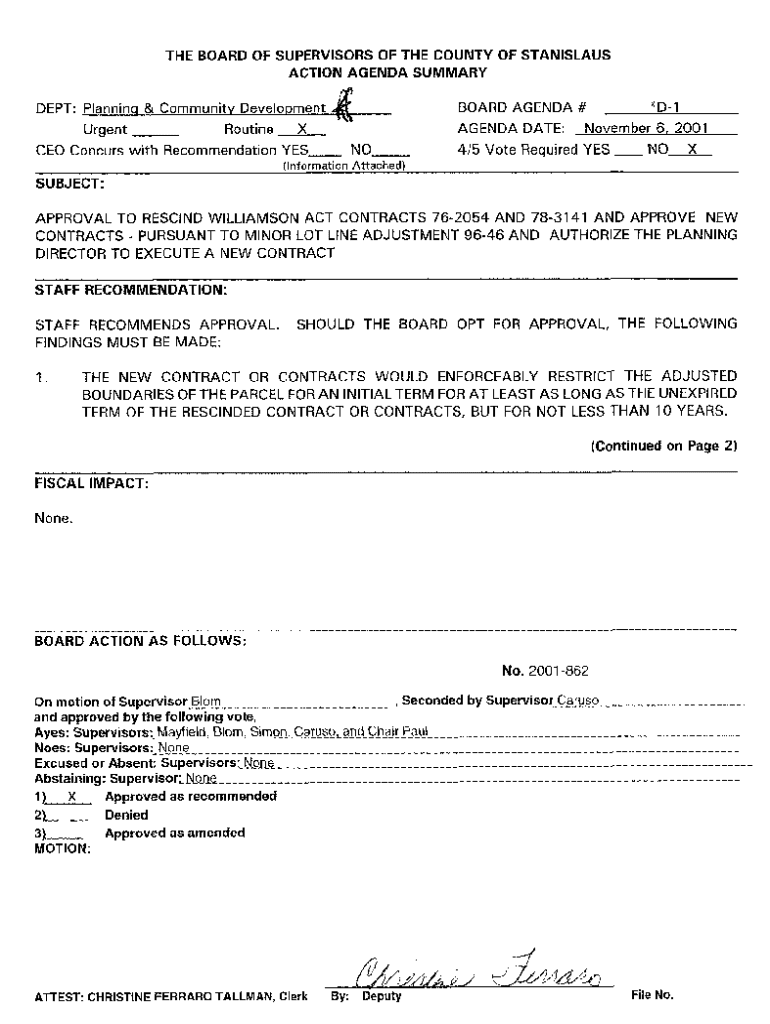 THE BOARD OF SUPERVISORS OF THE COUNTY OF STANISLAUS ACTION AGENDA SUMMARY DEPT: UrgentRoutineXCEO Concurs with Recommendation YESNOBOARD AGENDA # *D1 AGENDA DATE: November 6 . 2001 415 Vote Required