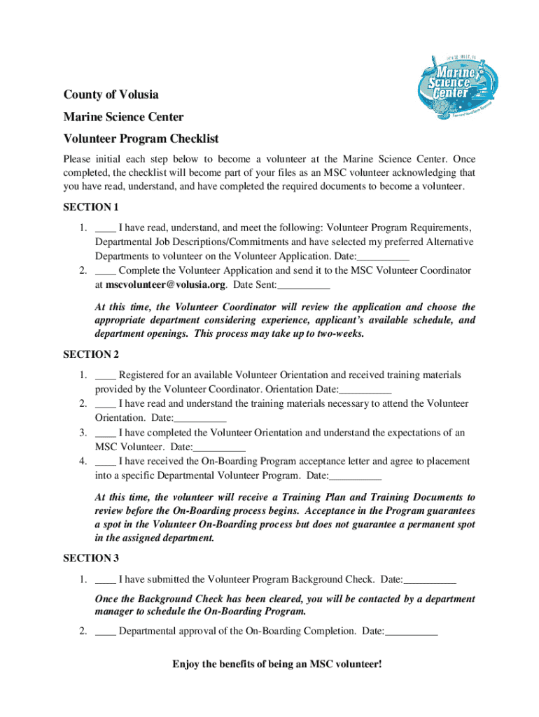 County of Volusia Marine Science Center Volunteer Program Checklist Please initial each step below to become a volunteer at the Marine Science Center. Once completed, the checklist will become part