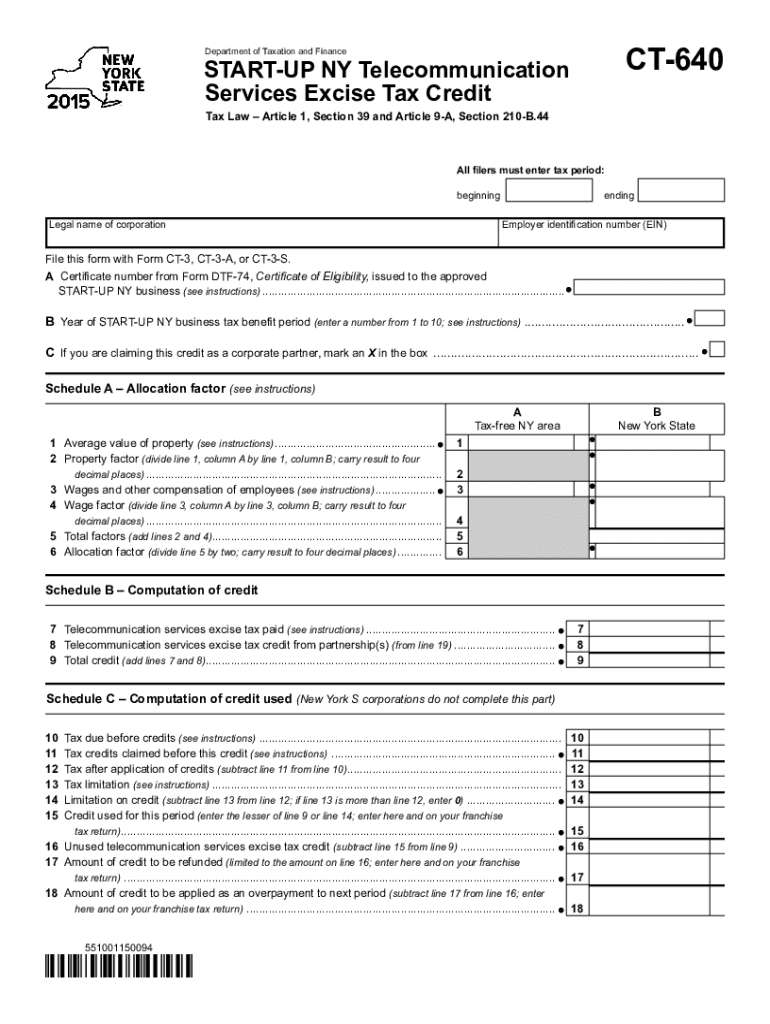 CT640Department of Taxation and FinanceSTARTUP NY Telecommunication Services Excise Tax Credit Tax Law Article 1, Section 39 and Article 9A, Section 210B.44All filers must enter tax period: beginningLegal