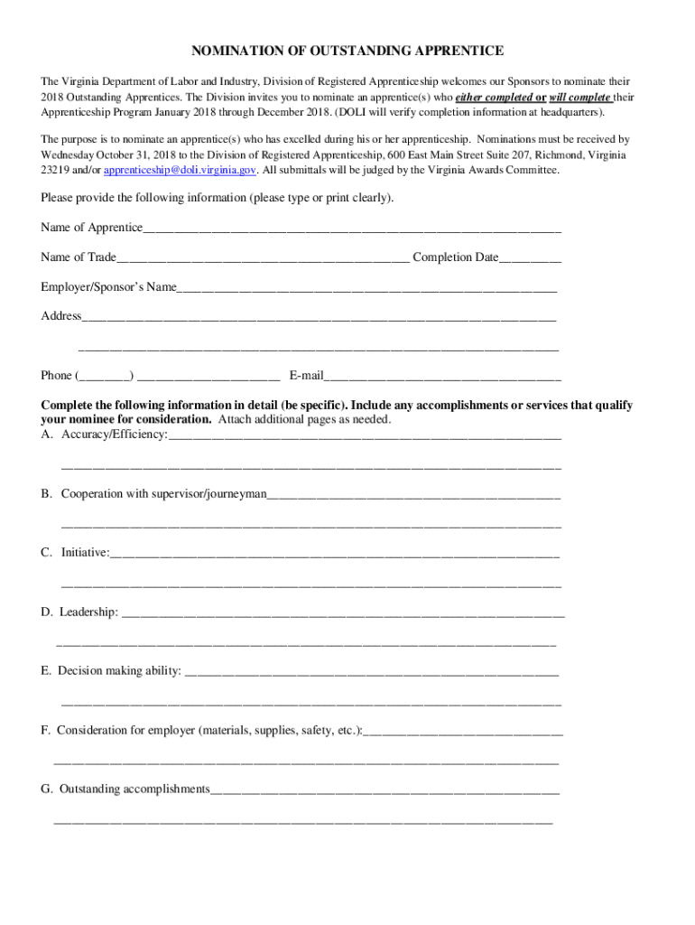 NOMINATION OF OUTSTANDING APPRENTICE The Virginia Department of Labor and Industry, Division of Registered Apprenticeship welcomes our Sponsors to nominate their 2018 Outstanding Apprentices. The