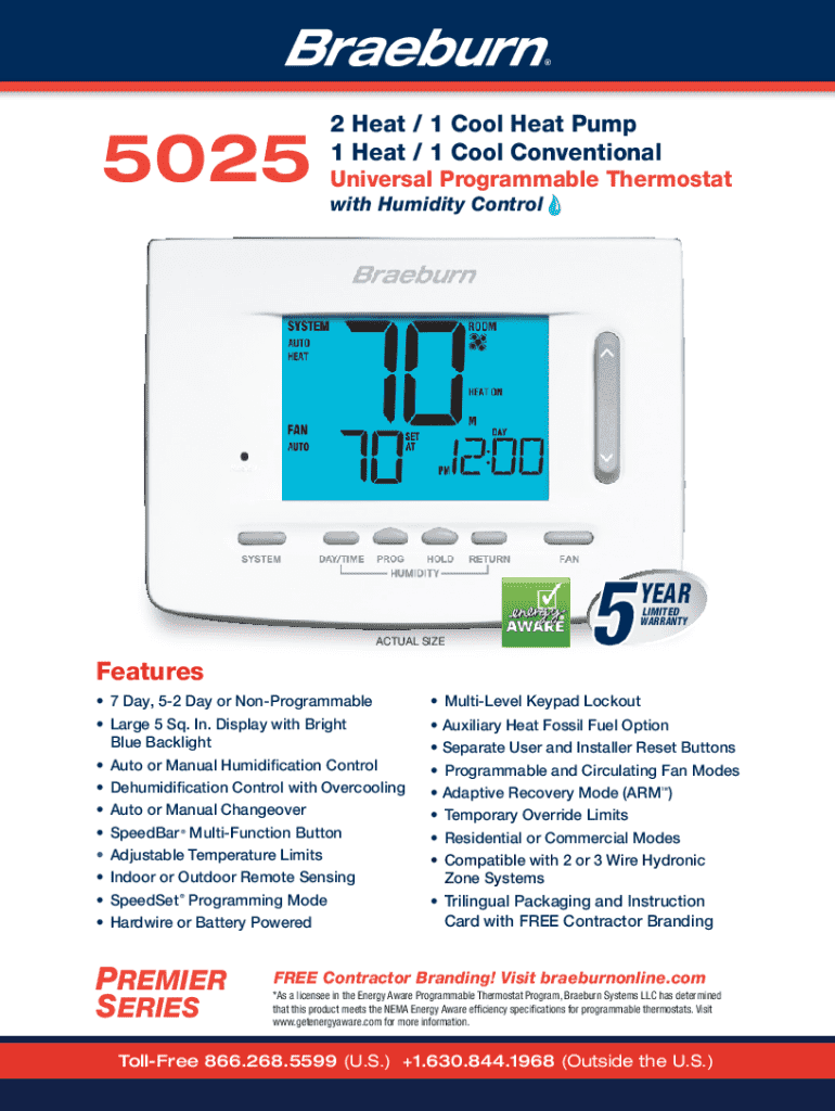 50252 Heat / 1 Cool Heat Pump 1 Heat / 1 Cool ConventionalUniversal Programmable Thermostat with Humidity ControlACTUAL SIZEFeatures 7 Day, 52 Day or NonProgrammable Large 5 Sq. In. Display with Bright