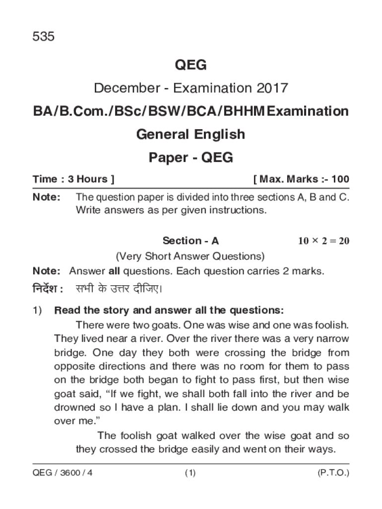 535QEG December Examination 2017 BA / B.Com. / BSc / BSW / BCA / BHHM Examination General English Paper QEG Time : 3 Hours ]Note:[ Max. Marks : 100The question paper is divided into three sections