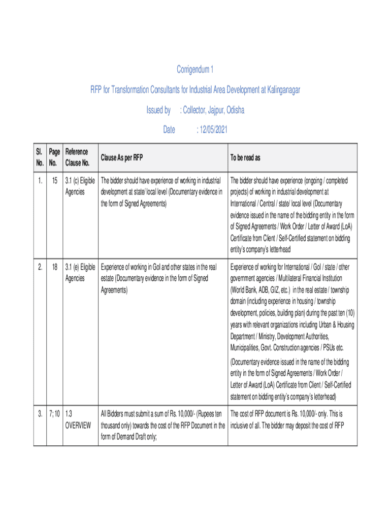 Corrigendum 1 RFP for Transformation Consultants for Industrial Area Development at Kalinganagar Issued by Date Sl. No.Page No.1.152.18Reference Clause No.: Collector, Jajpur, Odisha : 12/05/2021Clause