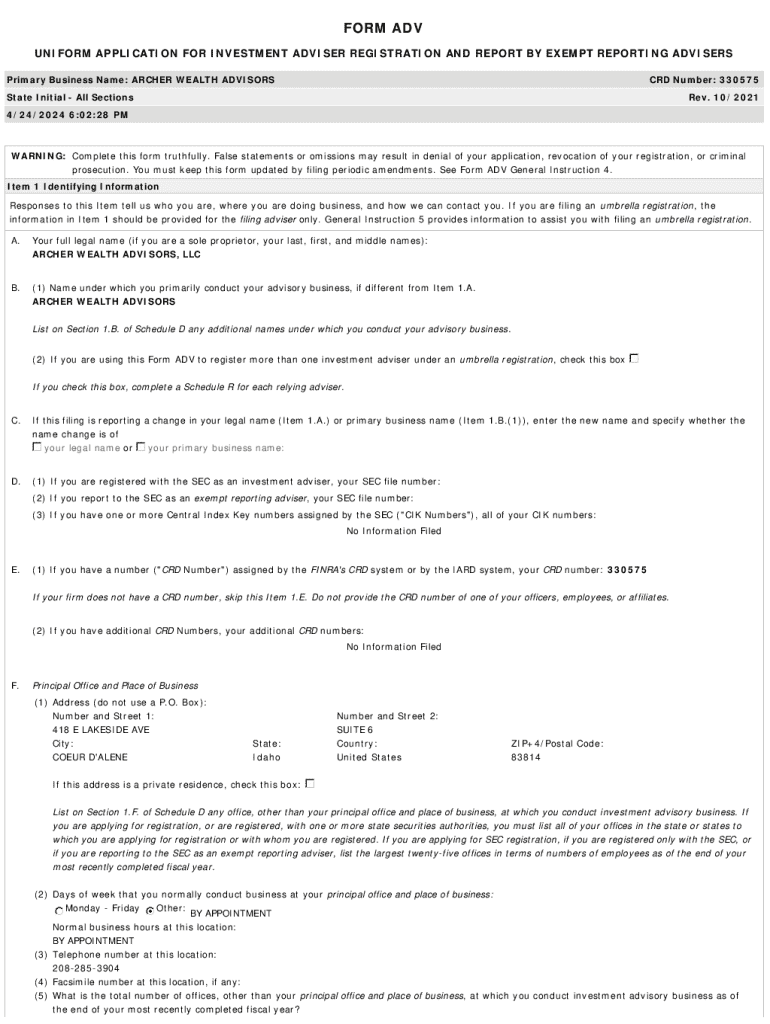 FORM ADV UNIFORM APPLICATION FOR INVESTMENT ADVISER REGISTRATION AND REPORT BY EXEMPT REPORTING ADVISERS Primary Business Name: ARCHER WEALTH ADVISORSCRD Number: 330575State Initial All SectionsRev.