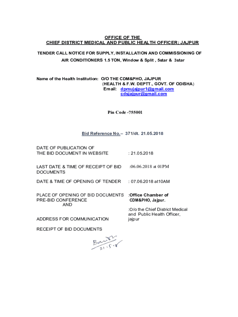 OFFICE OF THE CHIEF DISTRICT MEDICAL AND PUBLIC HEALTH OFFICER; JAJPUR TENDER CALL NOTICE FOR SUPPLY, INSTALLATION AND COMMISSIONING OF AIR CONDITIONERS 1.5 TON, Window & Split , 5star & 3starName