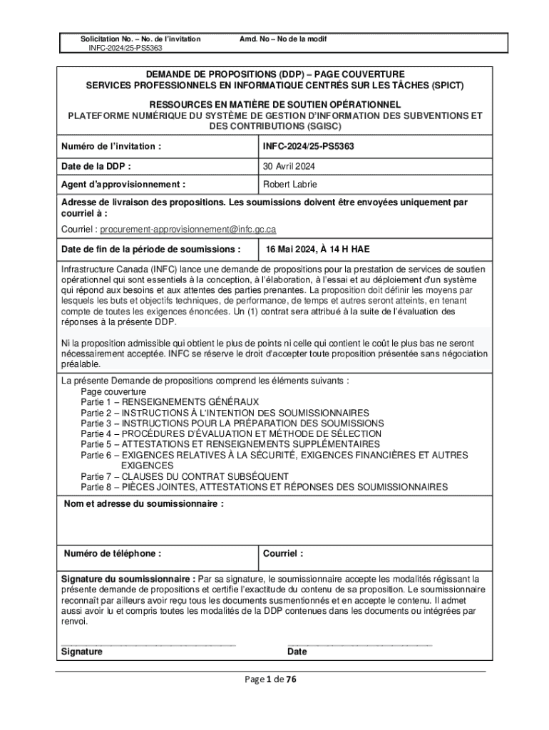 Solicitation No. No. de linvitation INFC2024/25PS5363Amd. No No de la modifDEMANDE DE PROPOSITIONS (DDP) PAGE COUVERTURE SERVICES PROFESSIONNELS EN INFORMATIQUE CENTRS SUR LES TCHES (SPICT) RESSOURCES
