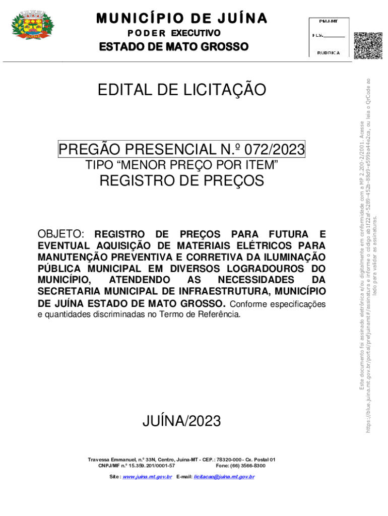 MUNICPIO DE JUNA P O D E R EXECUTIVOEDITAL DE LICITAOPREGO PRESENCIAL N. 072/2023 TIPO MENOR PREO POR ITEMREGISTRO DE PREOSOBJETO: REGISTRO DE PREOS PARA FUTURA E EVENTUAL AQUISIO DE MATERIAIS ELTRICOS