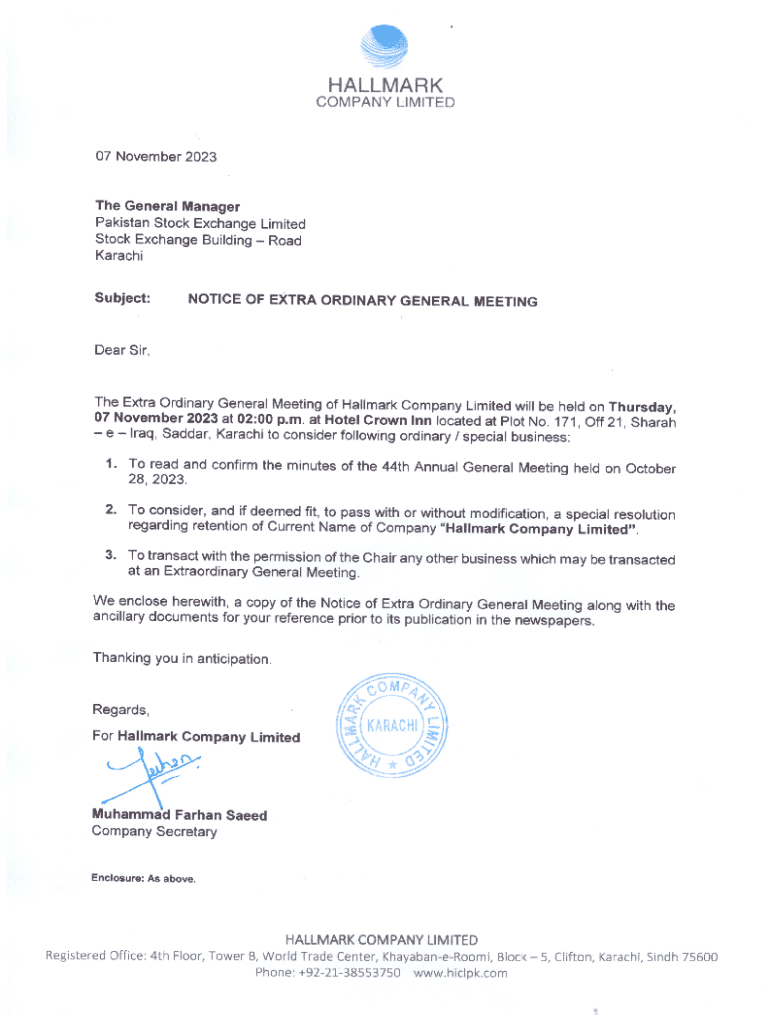 Notice of Extra Ordinary General Meeting Notice is hereby given to the Members that the Extra Ordinary General Meeting of Hallmark Company Limited will be held on Thursday, November 30, 2023 at 02:00