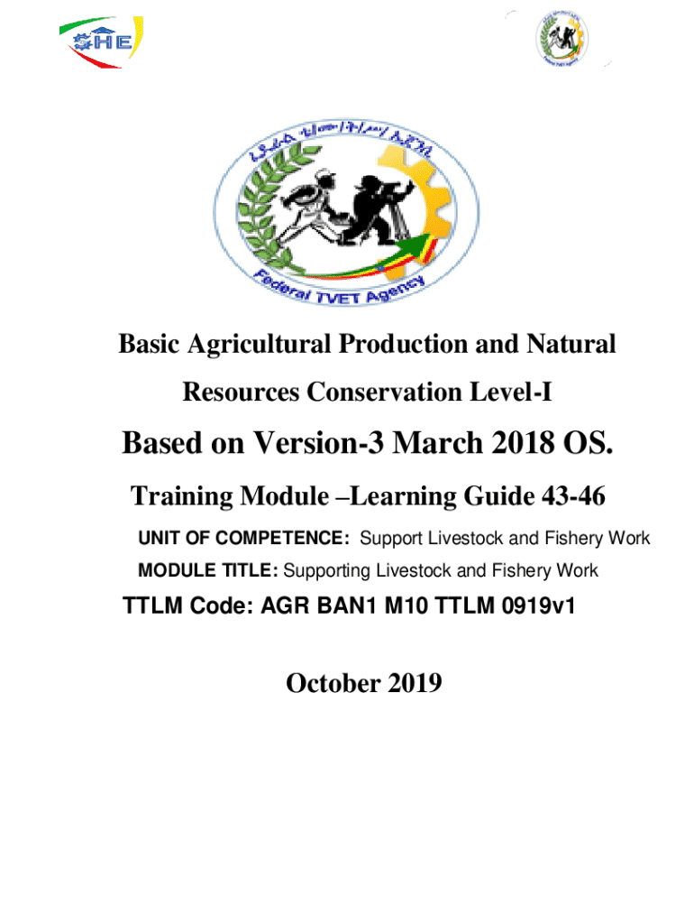Basic Agricultural Production and Natural Resources Conservation LevelIBased on Version3 March 2018 OS. Training Module Learning Guide 4346 UNIT OF COMPETENCE: Support Livestock and Fishery Work MODULE