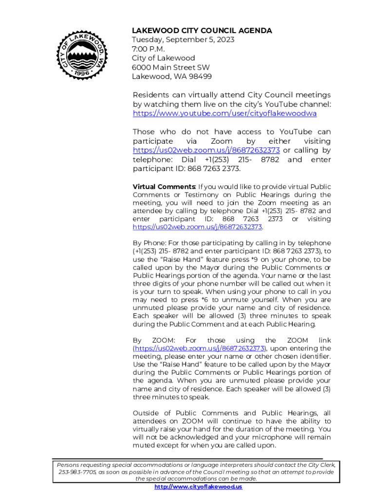 LAKEWOOD CITY COUNCIL AGENDA Tuesday, September 5, 2023 7:00 P.M. City of Lakewood 6000 Main Street SW Lakewood, WA 98499 Residents can virtually attend City Council meetings by watching them live