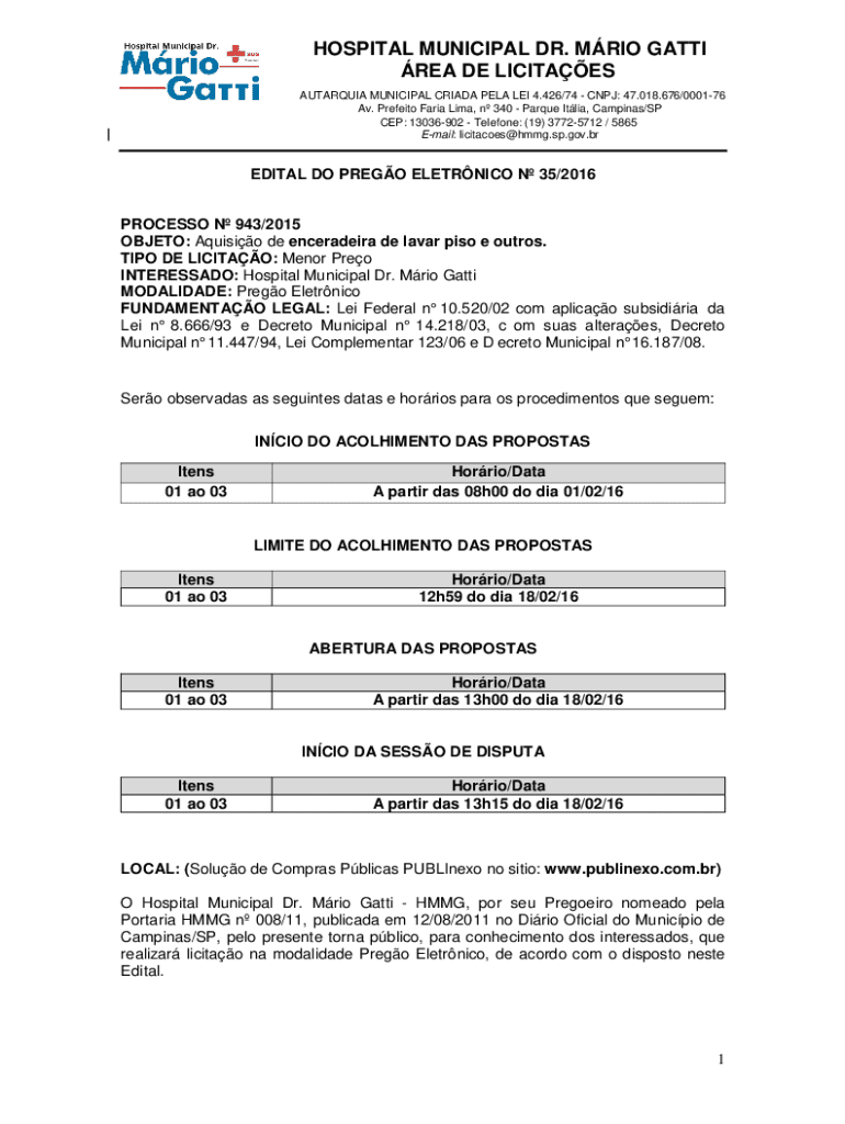 HOSPITAL MUNICIPAL DR. MRIO GATTI REA DE LICITAES AUTARQUIA MUNICIPAL CRIADA PELA LEI 4.426/74 CNPJ: 47.018.676/000176 Av. Prefeito Faria Lima, n 340 Parque Itlia, Campinas/SP CEP: 13036902 Telefone: