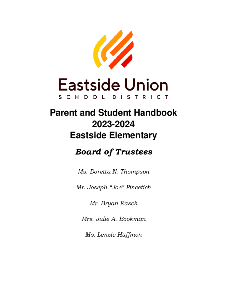 Parent and Student Handbook 20232024 Eastside Elementary Board of Trustees Ms. Doretta N. Thompson Mr. Joseph Joe Pincetich Mr. Bryan Rasch Mrs. Julie A. Bookman Ms. Lenzie HuffmonThis Parent and