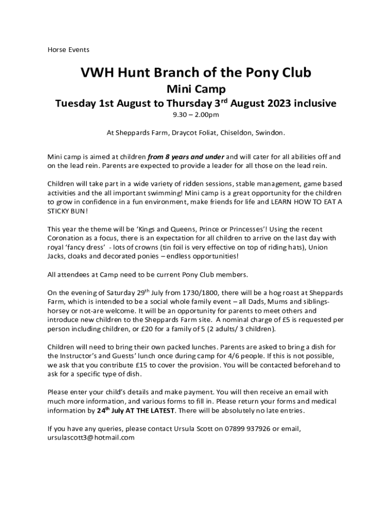 Horse EventsVWH Hunt Branch of the Pony Club Mini Camp Tuesday 1st August to Thursday 3rd August 2023 inclusive 9.30 2.00pm At Sheppards Farm, Draycot Foliat, Chiseldon, Swindon. Mini camp is aimed