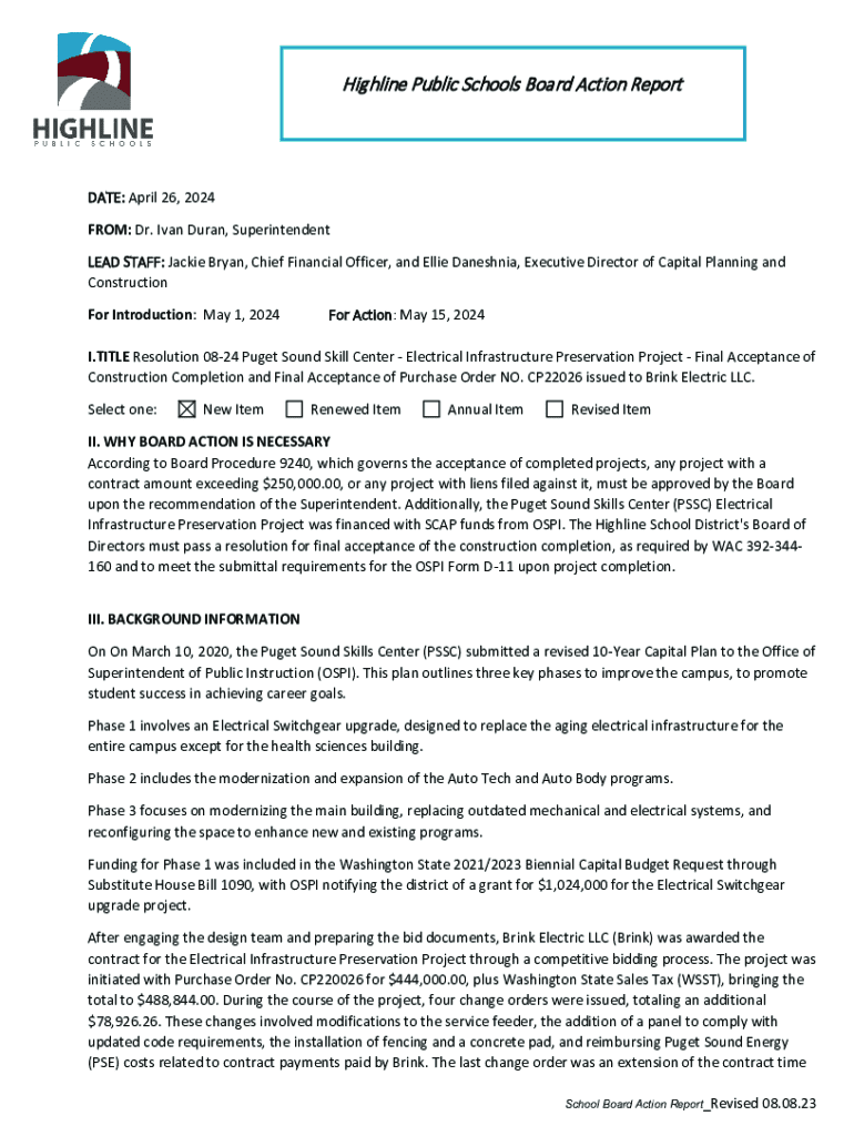 High line Public Schools Board Action Reportage: April 26, 2024,