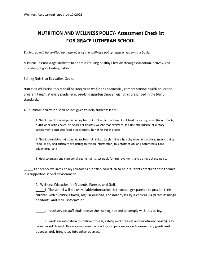 Wellness Assessment updated 10/2023NUTRITION AND WELLNESS POLICY Assessment Checklist FOR GRACE LUTHERAN SCHOOL Each area will be verified by a member of the wellness policy team on an annual basis.