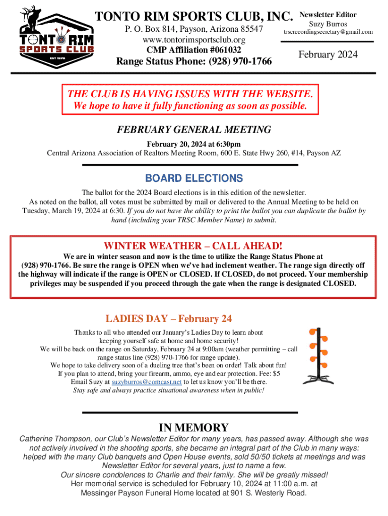 TONTO RIM SPORTS CLUB, INC. P. O. Box 814, Payson, Arizona 85547 www.tontorimsportsclub.org CMP Affiliation #061032Newsletter Editor Suzy Burrostrscrecordingsecretary@gmail.comRange Status Phone: