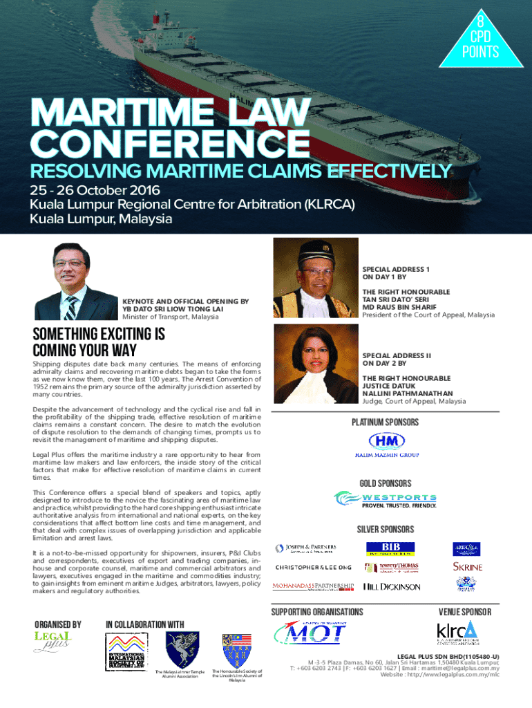 8 CPD POINTSMARITIME LAW CONFERENCERESOLVING MARITIME CLAIMS EFFECTIVELY 25 26 October 2016 Kuala Lumpur Regional Centre for Arbitration (KLRCA) Kuala Lumpur, MalaysiaSPECIAL ADDRESS 1 ON DAY 1 BY