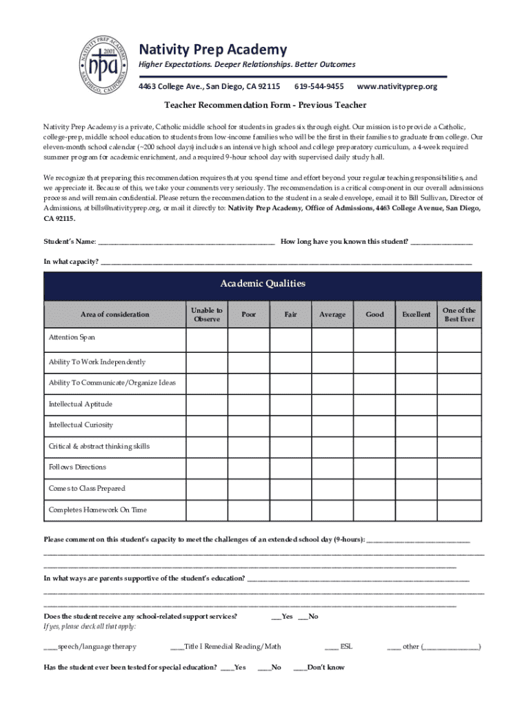 4463 College Ave., San Diego, CA 921156195449455www.nativity prep.teacher Recommendation Form Previous Teacher