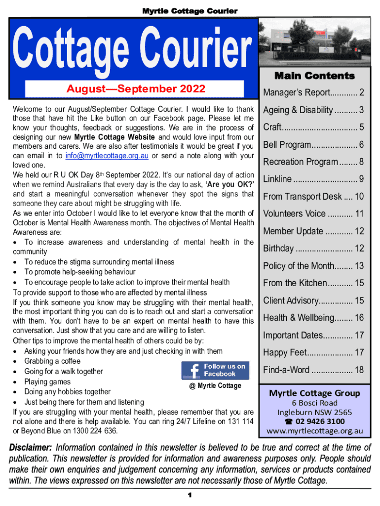 Myrtle Cottage CourierMain ContentsAugustSeptember 2022Managers Report............ 2Welcome to our August/September Cottage Courier. I would like to thank those that have hit the Like button on our
