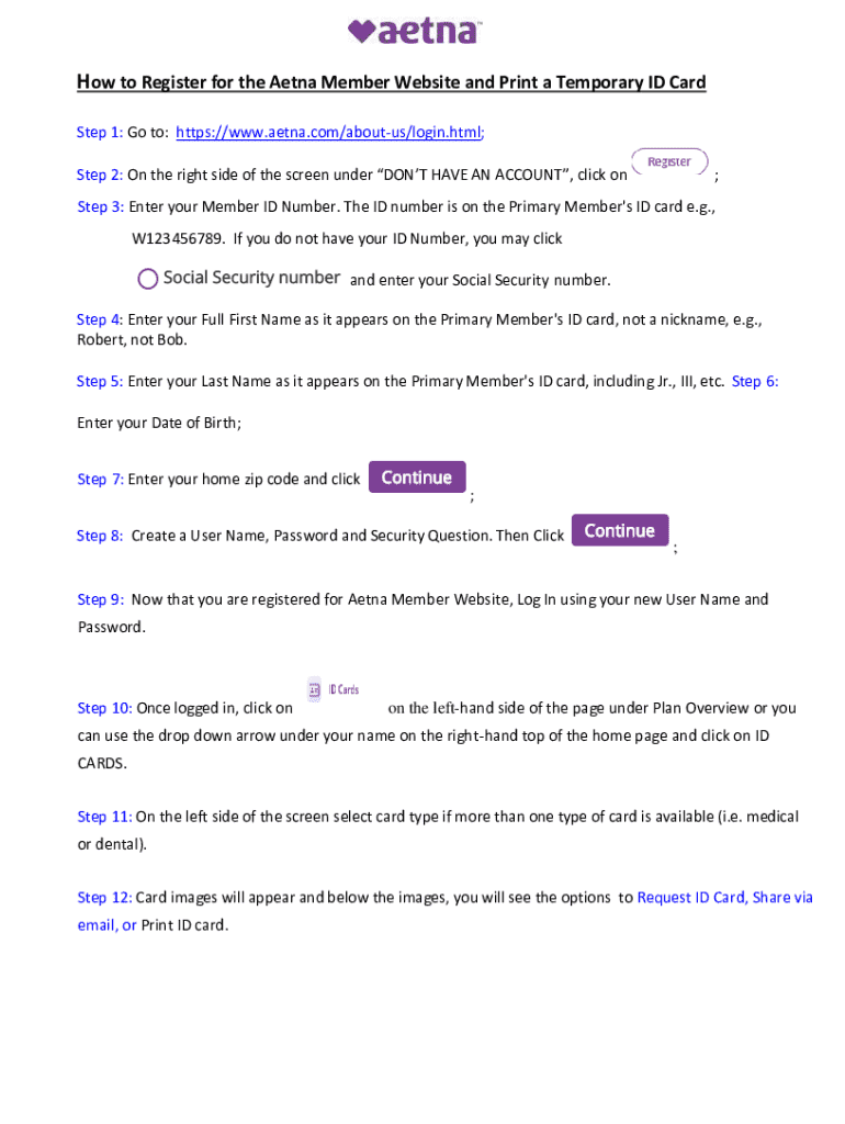 How to Register for the Aetna Member Website and Print a Temporary ID Card Step 1: Go to: https://www.aetna.com/aboutus/login.html; Step 2: On the right side of the screen under DON'T HAVE AN ACCOUNT,