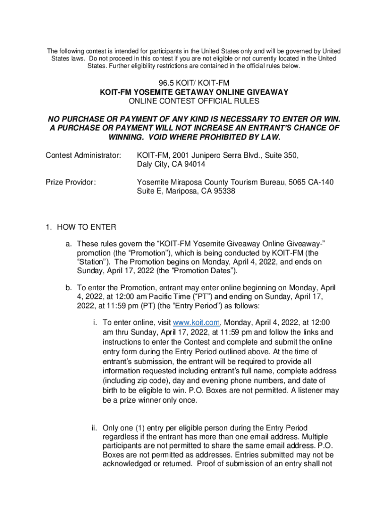 To fill out koityosemite-getawayonline-contest-rules, the organizer needs to specify the entry criteria, prize details, eligibility requirements, and any other relevant information.