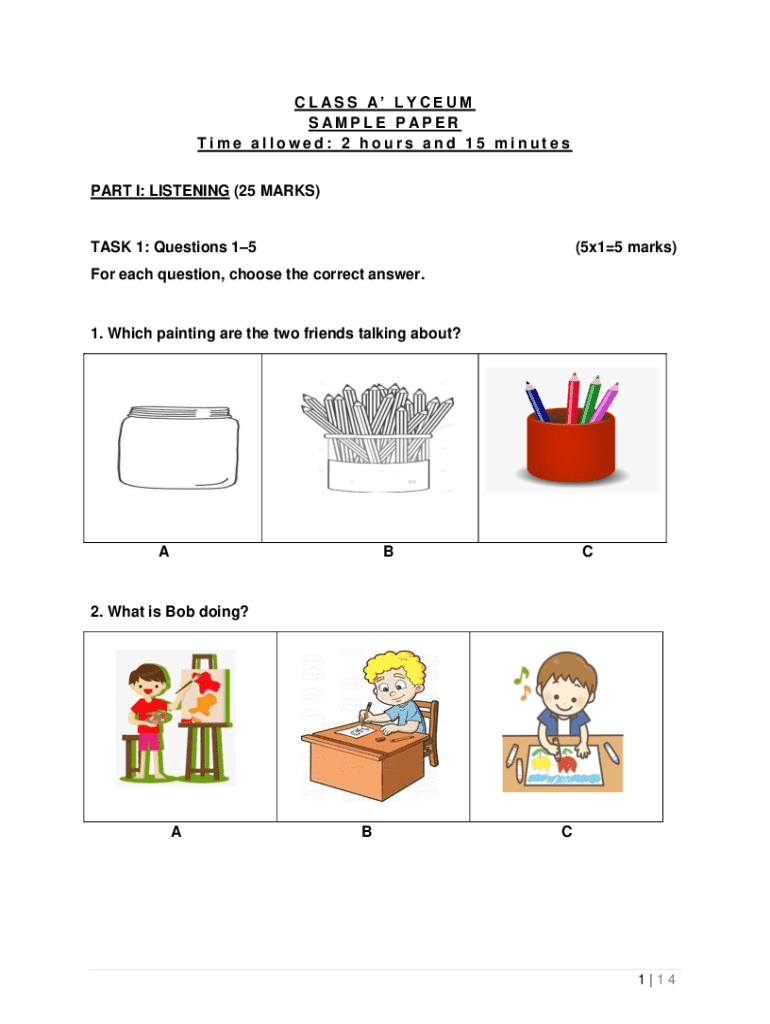 CLASS A LYCEUM SAMPLE PAPER Time allowed: 2 hours and 15 minutes PART I: LISTENING (25 MARKS)TASK 1: Questions 15(5×15 marks)For each question, choose the correct answer.1. Which painting are the
