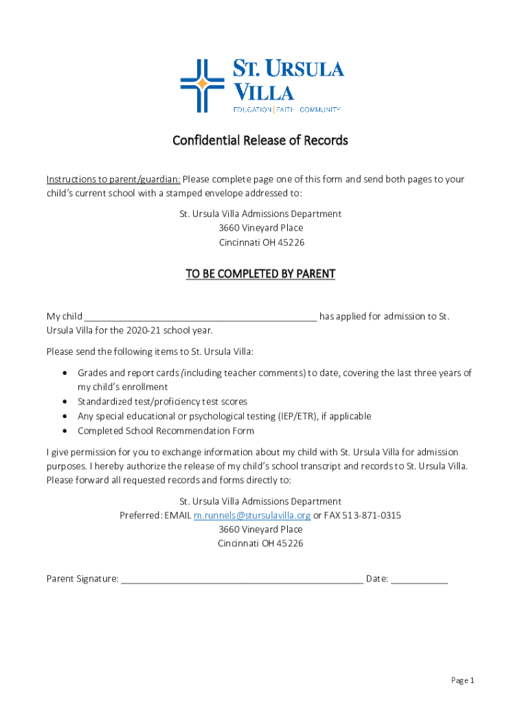 Confidential Release of Records Instructions to parent/guardian: Please complete page one of this form and send both pages to your children current school with a stamped envelope addressed to: St.